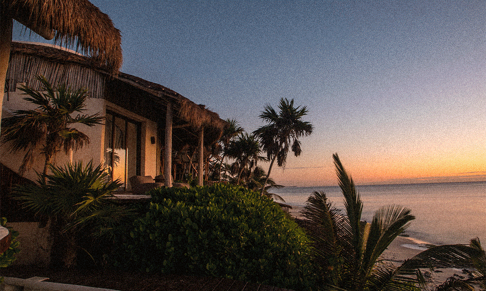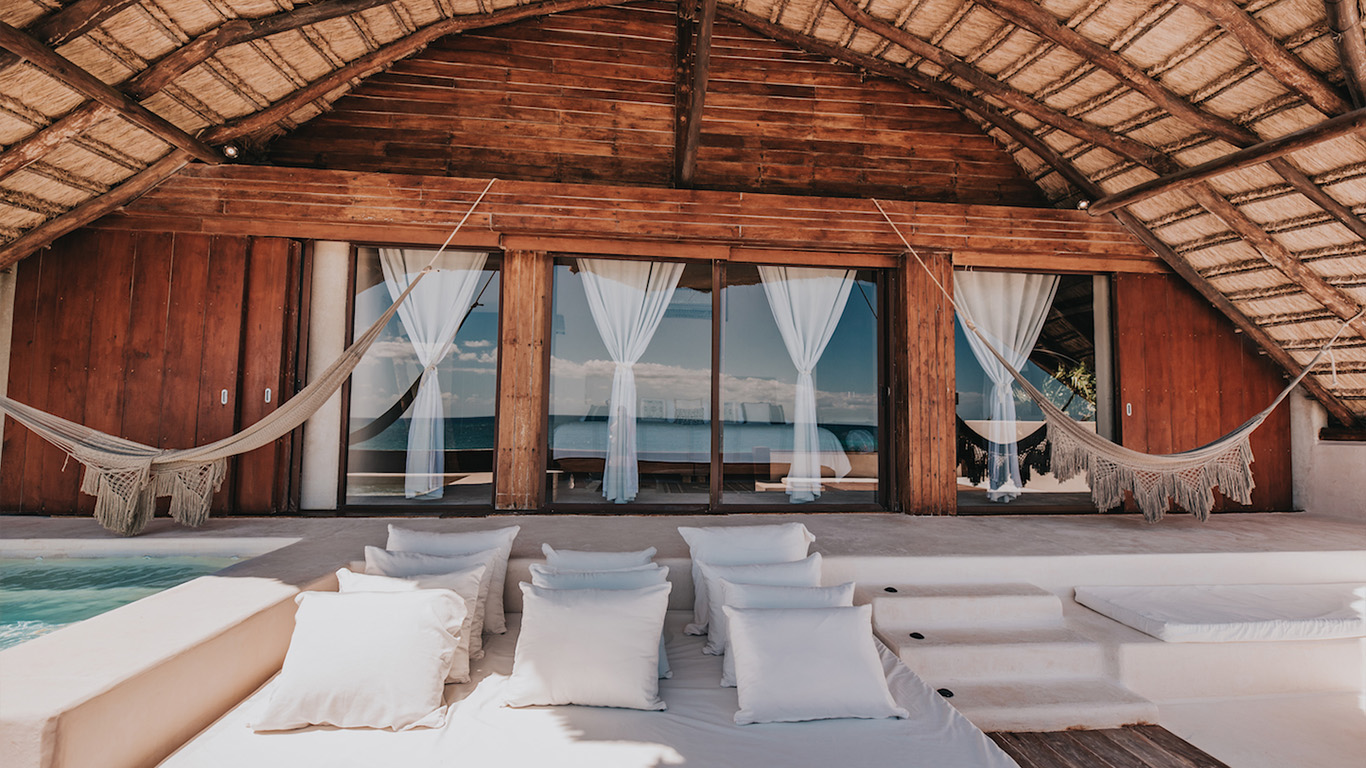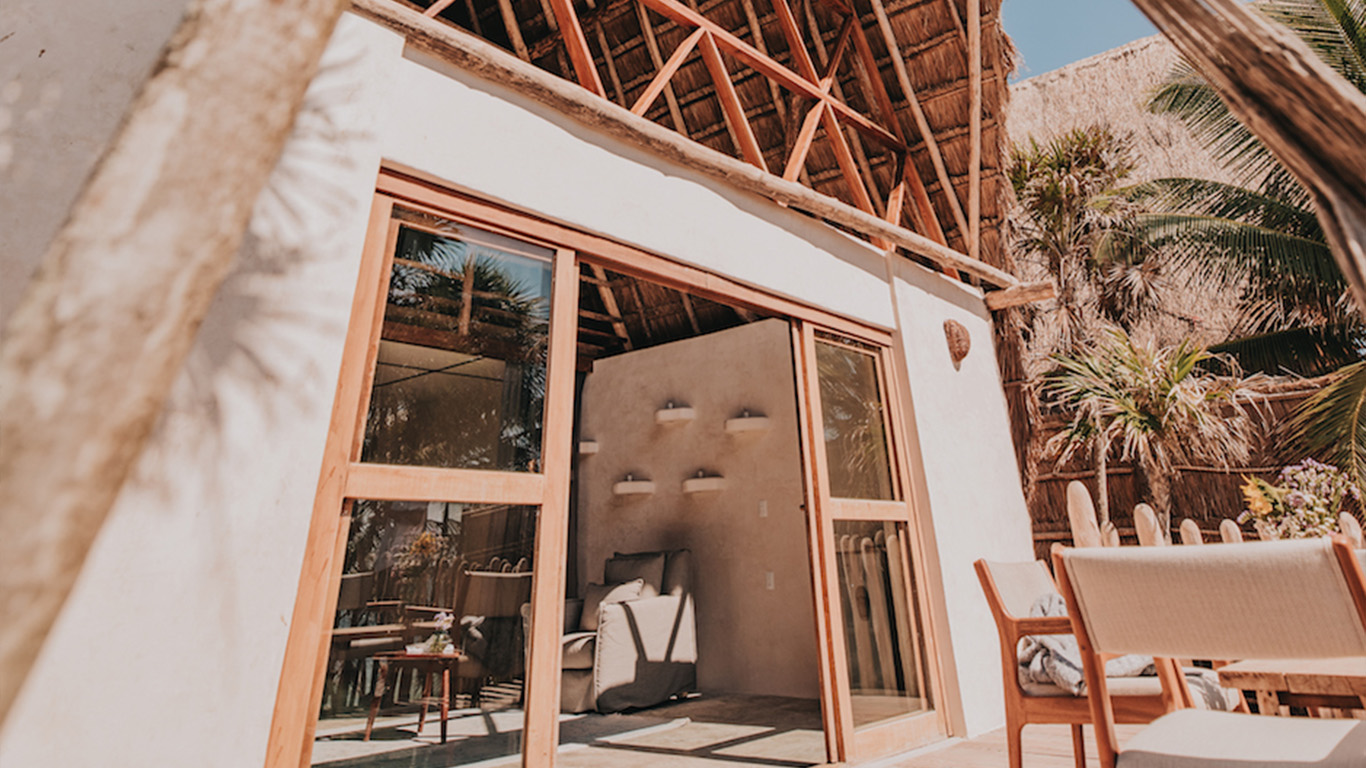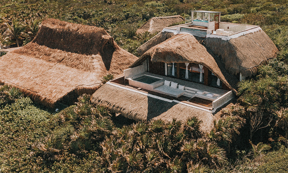 Two-bedroom cabana suites sit above a rocky coastline, with direct beach access and striking sea views. In classic Tulum style with palapa roofs and open spaces, they feel like a hideaway in the sky for friends or small families—ritual by day, music by night.